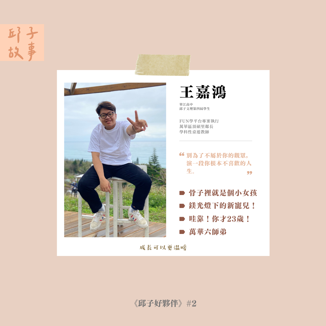 但你不能怪其他人,因為嘉鴻長得真的頗有年紀,彷彿生命不知道已走過幾個關頭般的樣貌,當然跟他的打扮十分有關連,標配襯衫紮褲子、褲子穿高腰而且一定會繫皮帶、手錶銀色超大一個、頭髮一定要後抓、外加體型很龐大、配上老氣的對話方式,你很難相信,他才23歲。