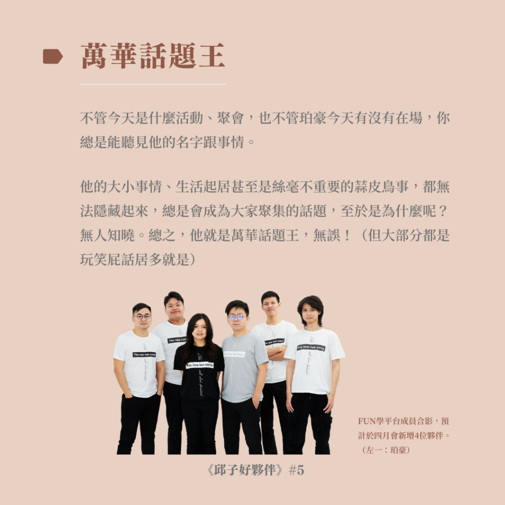 因著他的細心謹慎,在平台中他擔任了重要的進度追蹤與數據管控,看見他的謹慎,真會讚嘆說:你根本就是精算師!