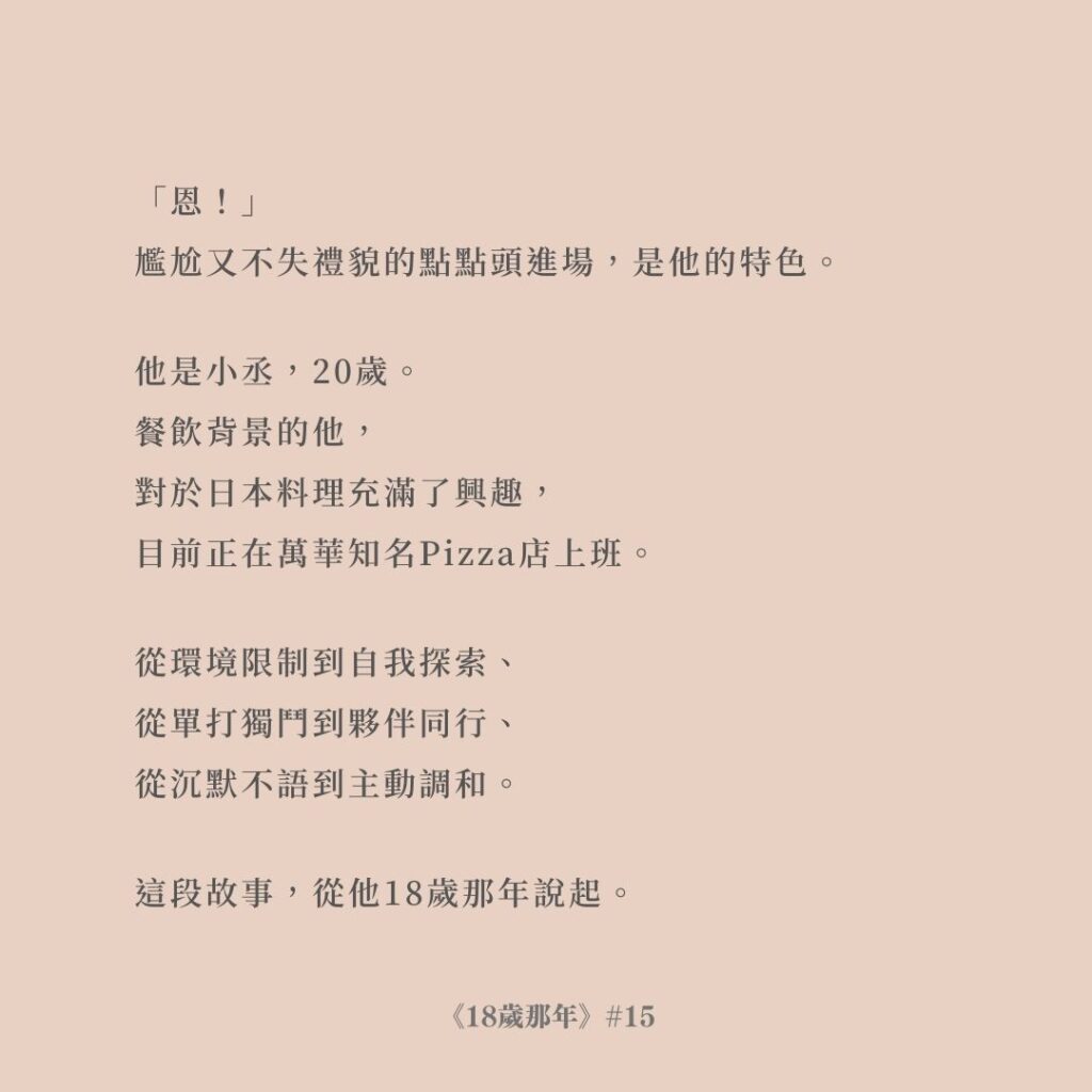「奕筑,我跟你說件事。」透過他的觀察,讓團隊裡每個小小的事情都可以被照顧到。熱愛輔佐大家的他,有時看見他的行動時,真想說聲:「唉呦你好像很暖喔~」