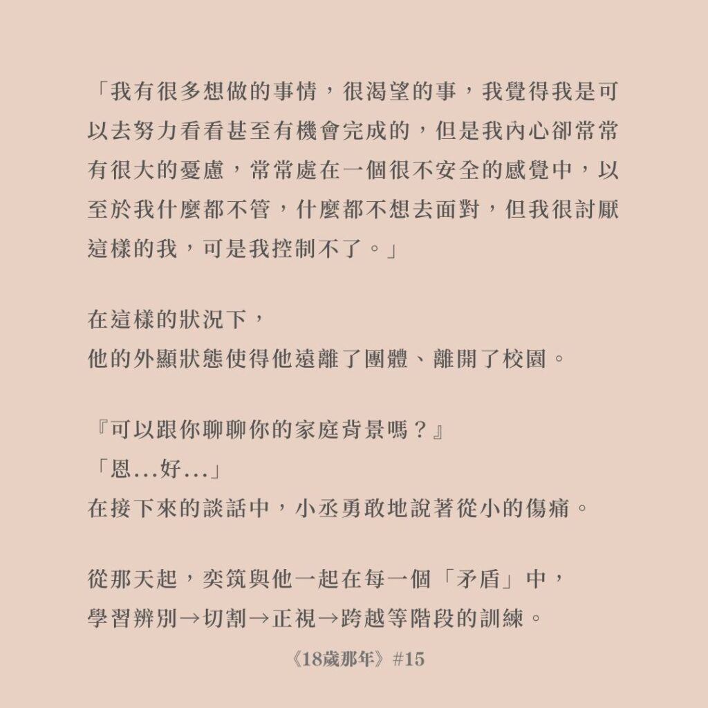 不喜歡囉嗦、複雜的她,並不代表她是個極簡又無聊甚至無腦(雖然是有一點啦…)的人,只是她遇到問題時,習慣性的會把內容一條一條的整理出來,並且就去一條一條執行處理。果斷、勇敢的她,是她高中時奕筑就給她的稱讚。